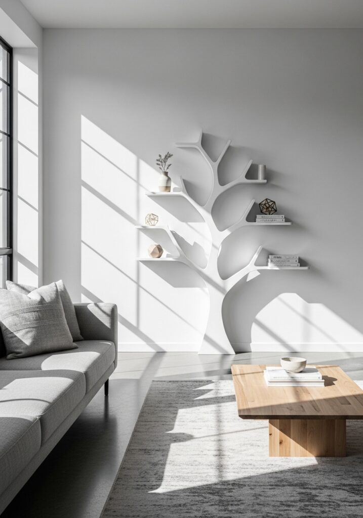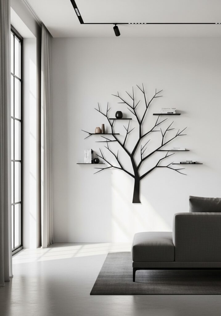 The floating tree shelf creates a stunning illusion of branches emerging directly from the wall without visible support. Its clean and minimal design enhances modern interiors, while soft lighting emphasizes the floating effect. Carefully placed decor items maintain balance and elegance.