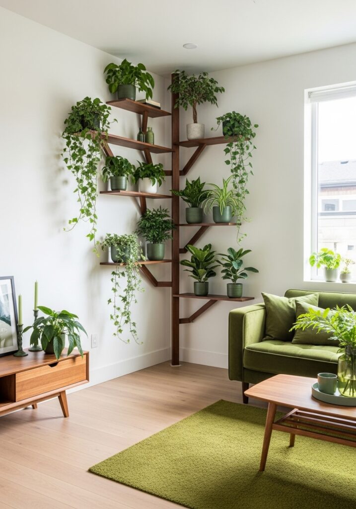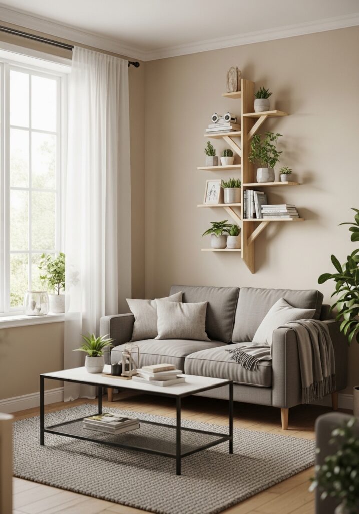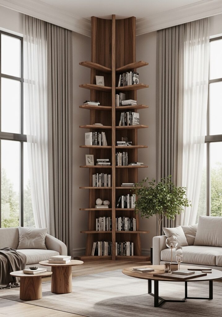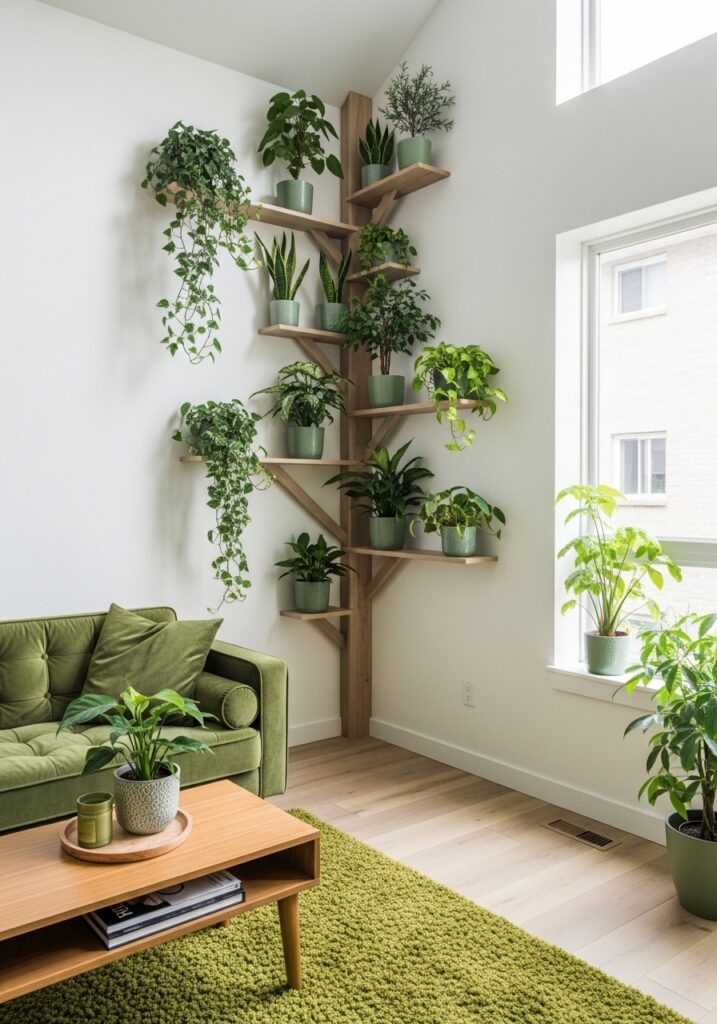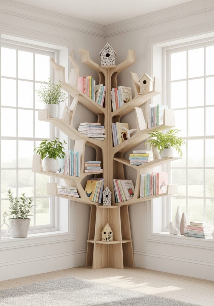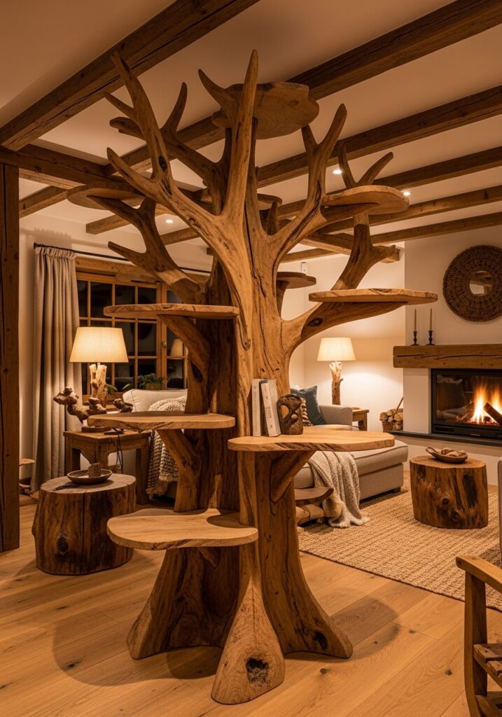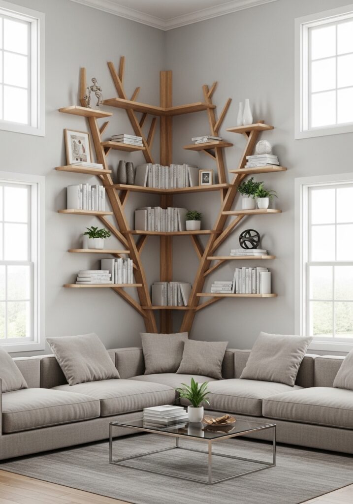 Combining greenery with functionality, this tree shelf integrates small planters into its branches. Natural light enhances the fresh and calming ambiance, making the living room feel vibrant and connected to nature.