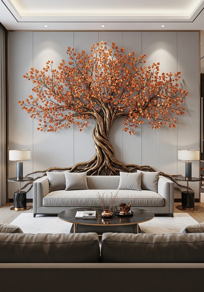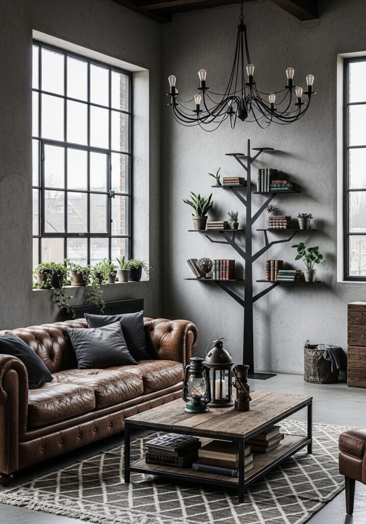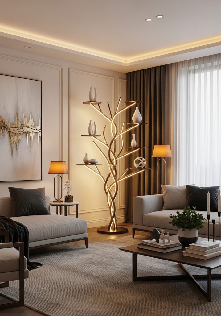 The industrial metal tree shelf is a bold and edgy design that perfectly suits modern loft-style living rooms. Made from black or dark steel, the shelf features raw, branch-like extensions that create a striking silhouette against a concrete or textured wall. The industrial aesthetic is enhanced by the use of darker tones and minimal decor, allowing the structure itself to stand out. Soft, moody lighting casts dramatic shadows, adding depth and character to the space. The shelf can hold books, small sculptures, or metallic decor items that complement the overall theme. Paired with leather furniture and rugged materials, this design creates a strong, masculine vibe. It is ideal for those who prefer a contemporary yet slightly rugged interior style. The combination of functionality and artistic form makes it a standout feature in any living room, offering both storage and visual impact.