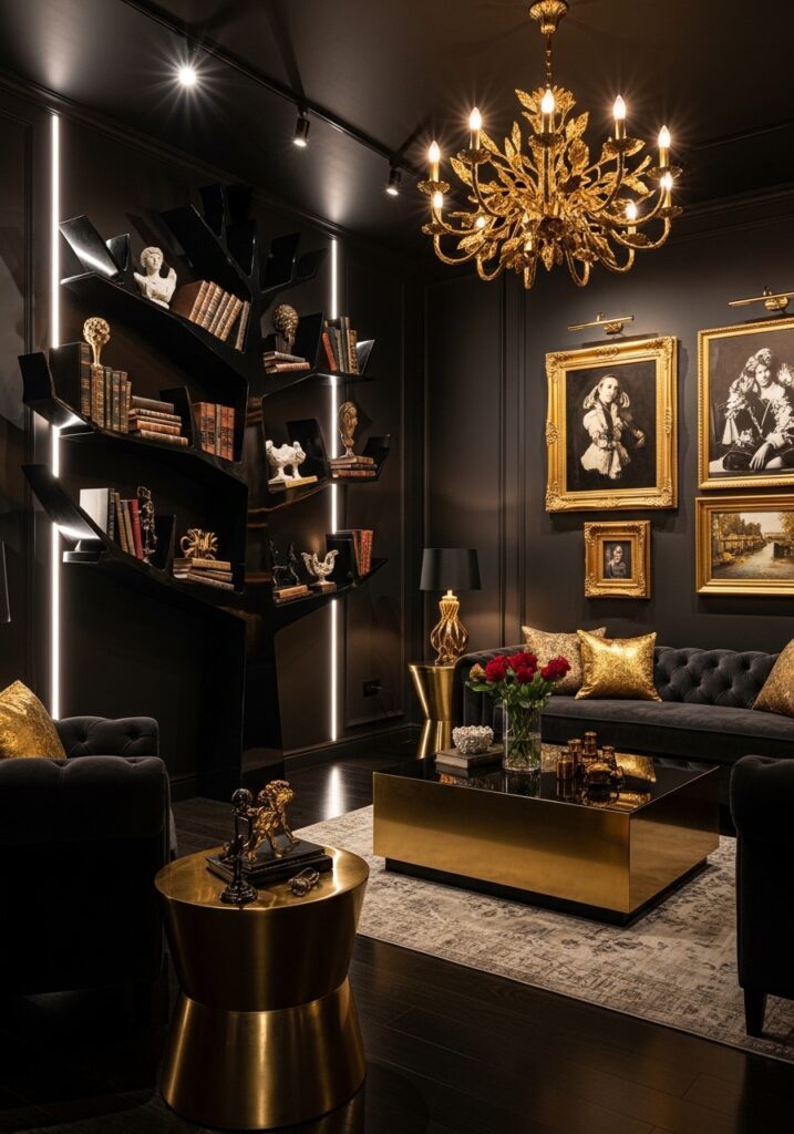 This dark luxury tree shelf design features deep tones, premium materials, and dramatic lighting. The shelf stands out against a dark background, complemented by gold accents and high-end decor elements, creating a rich and sophisticated atmosphere.