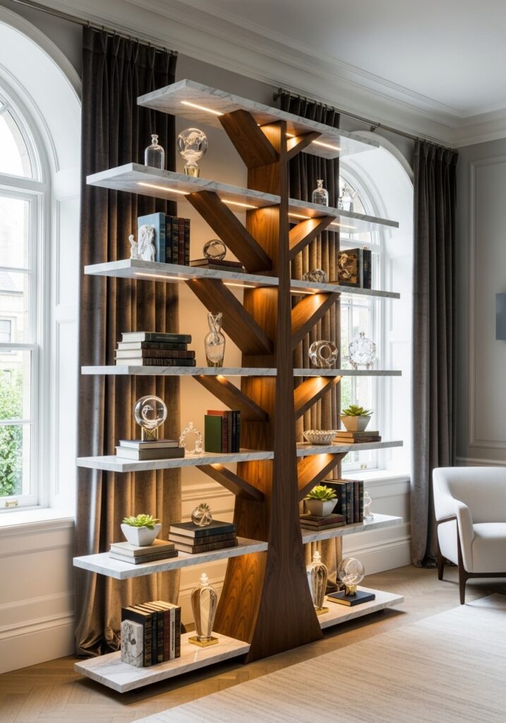 A premium combination of marble shelves and wooden branches creates a luxurious and elegant look. Soft lighting highlights the textures, making this design ideal for high-end interiors.